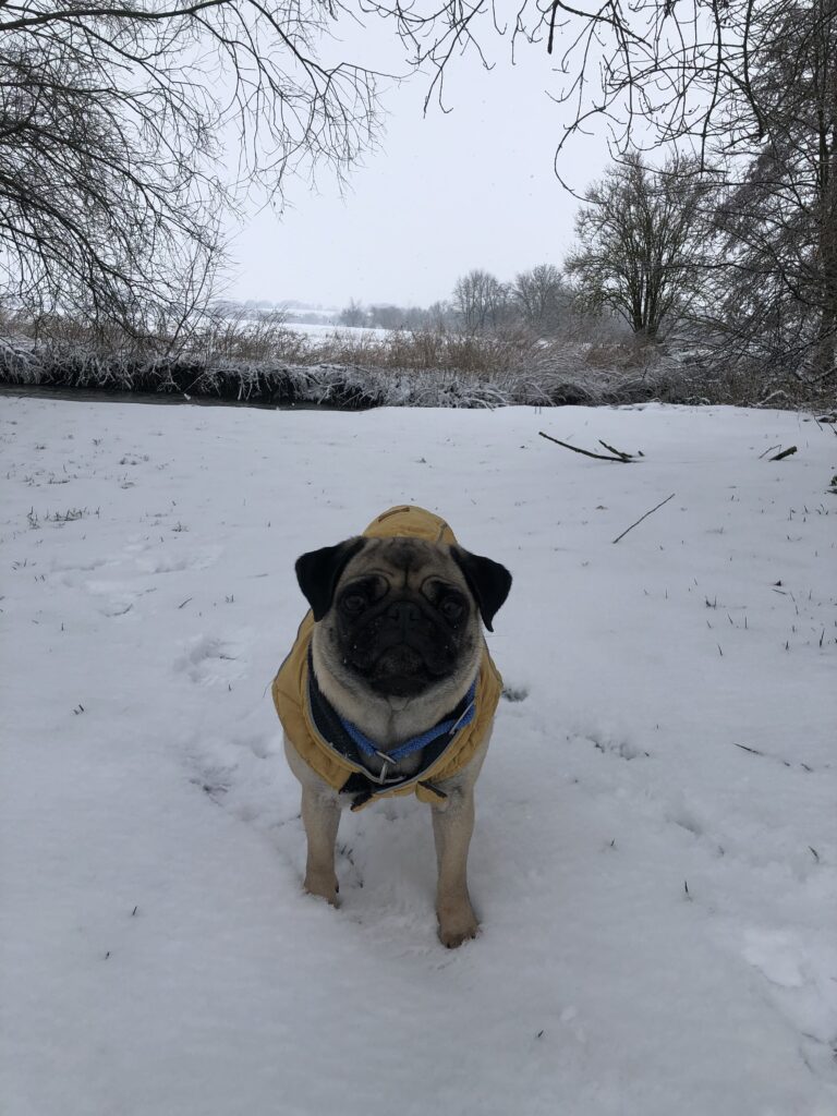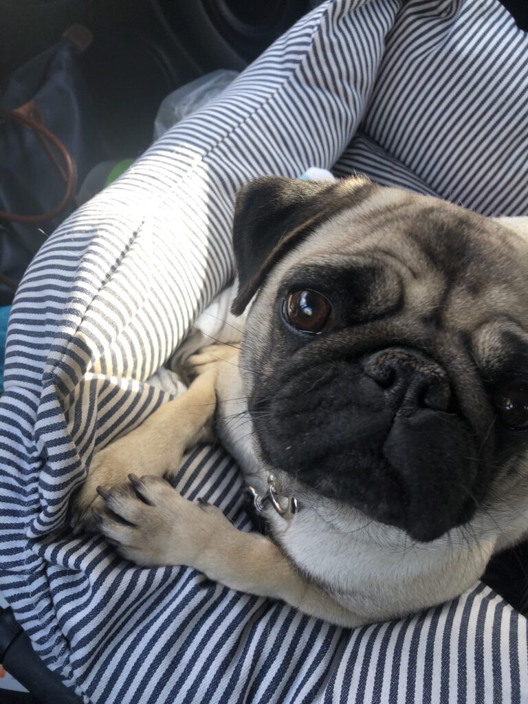 In Mamas Büchern bin ich ein furchtloser Polizeimops. Im wahren Leben liebe ich das Autofahren und bin mit Leib und Seele Co-Pilot. Immer dabei: Mein Autositz von WAHRE TIERLIEBE. Denn Sicherheit geht vor!